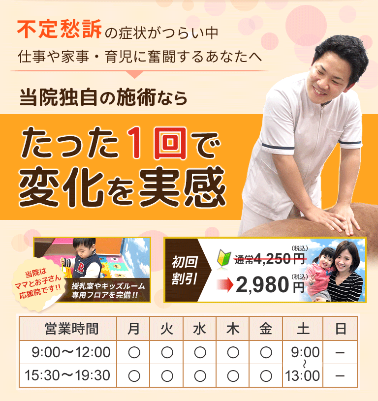 当院では、いつ頃からどんな症状が出ているか、生活リズム(睡眠・食事・運動)、お仕事や家事・育児の状況、病院での検査結果(わかる範囲で)を丁寧に伺い、体と心の状態を一緒に整理します。そのうえで、首・背骨・骨盤を整える施術と、都島での日常に取り入れやすいセルフケアを提案します。